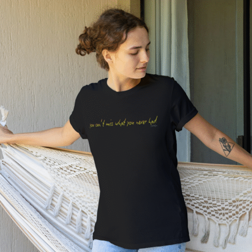 Make an impression with a statement that invites conversation. The ‘You can’t miss what you never had’ women’s t-shirt showcases a dynamic stroke-style design—rendered in vibrant bright yellow text for darker or muted shade tees, and in a rich red wine hue for soft coloured options. This playful yet impactful message is perfect for those who embrace life’s journey and always look forward to what lies ahead.